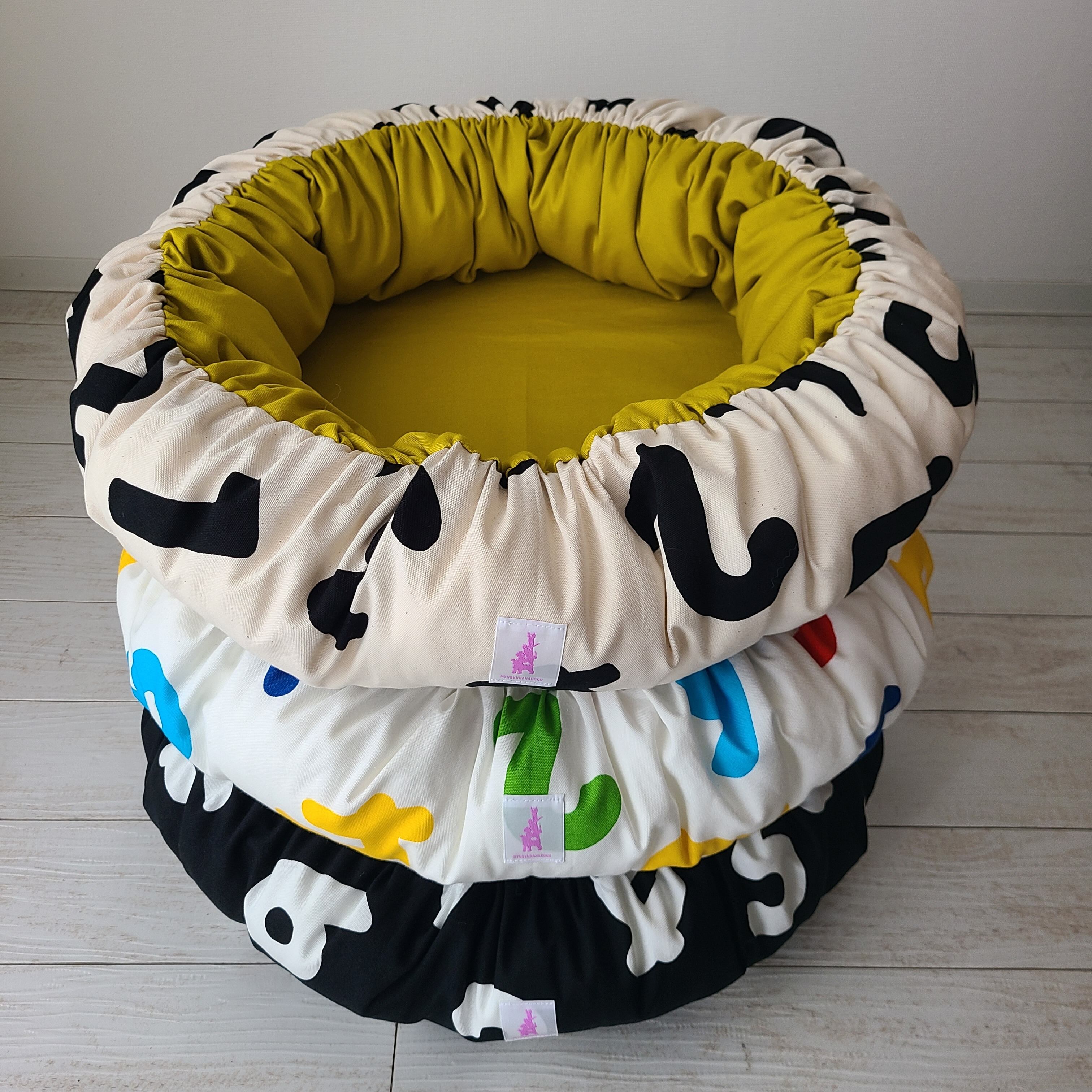 片面は生成り地に黒の数字柄、もう片面はマスタード無地で気分によって変えられ、簡単にくるっと裏返すことができるので、コロコロなどのお手入れも簡単です‼️