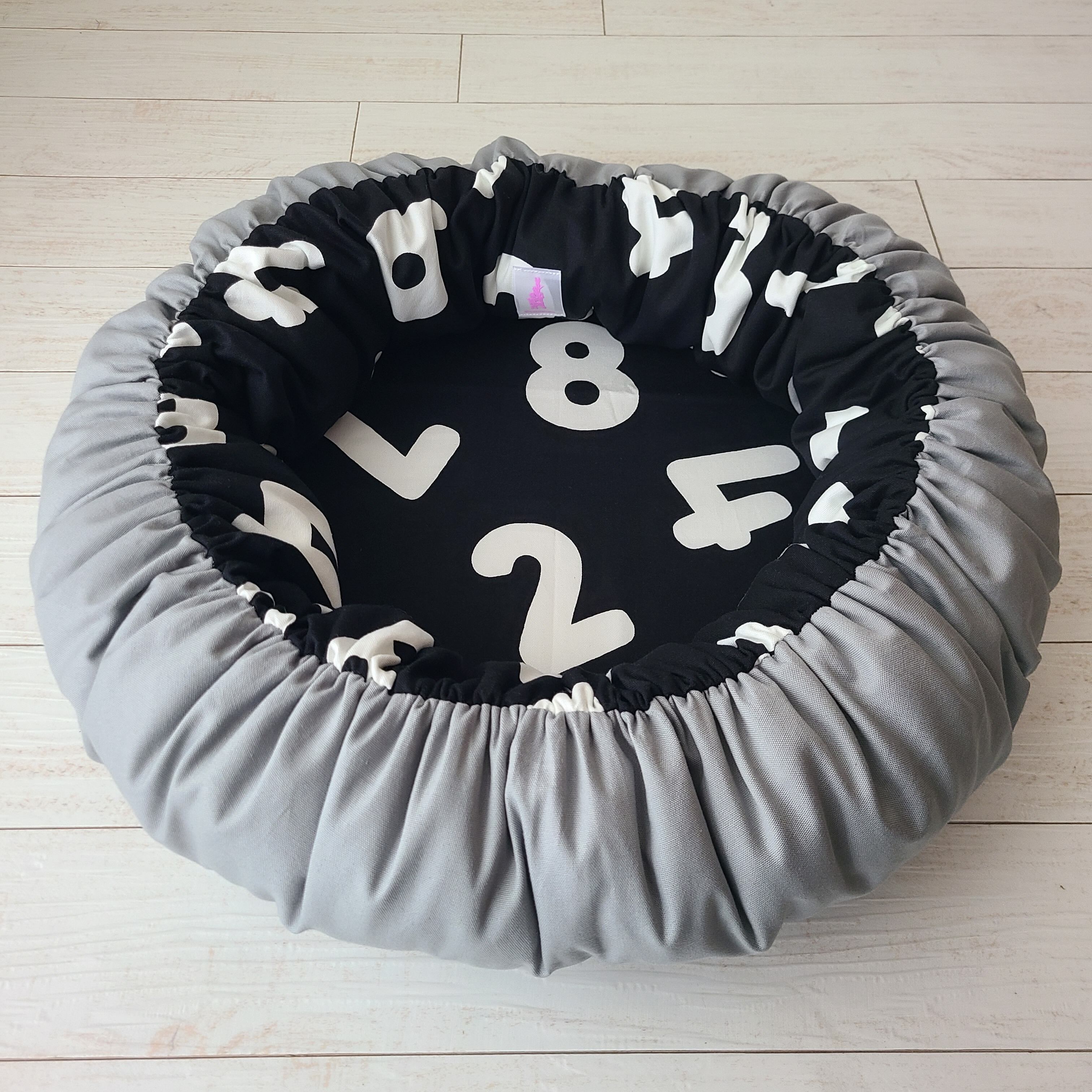 片面は黒地に白の数字柄、もう片面はグレー無地で気分によって変えられ、簡単にくるっと裏返すことができるので、コロコロなどのお手入れも簡単です‼️